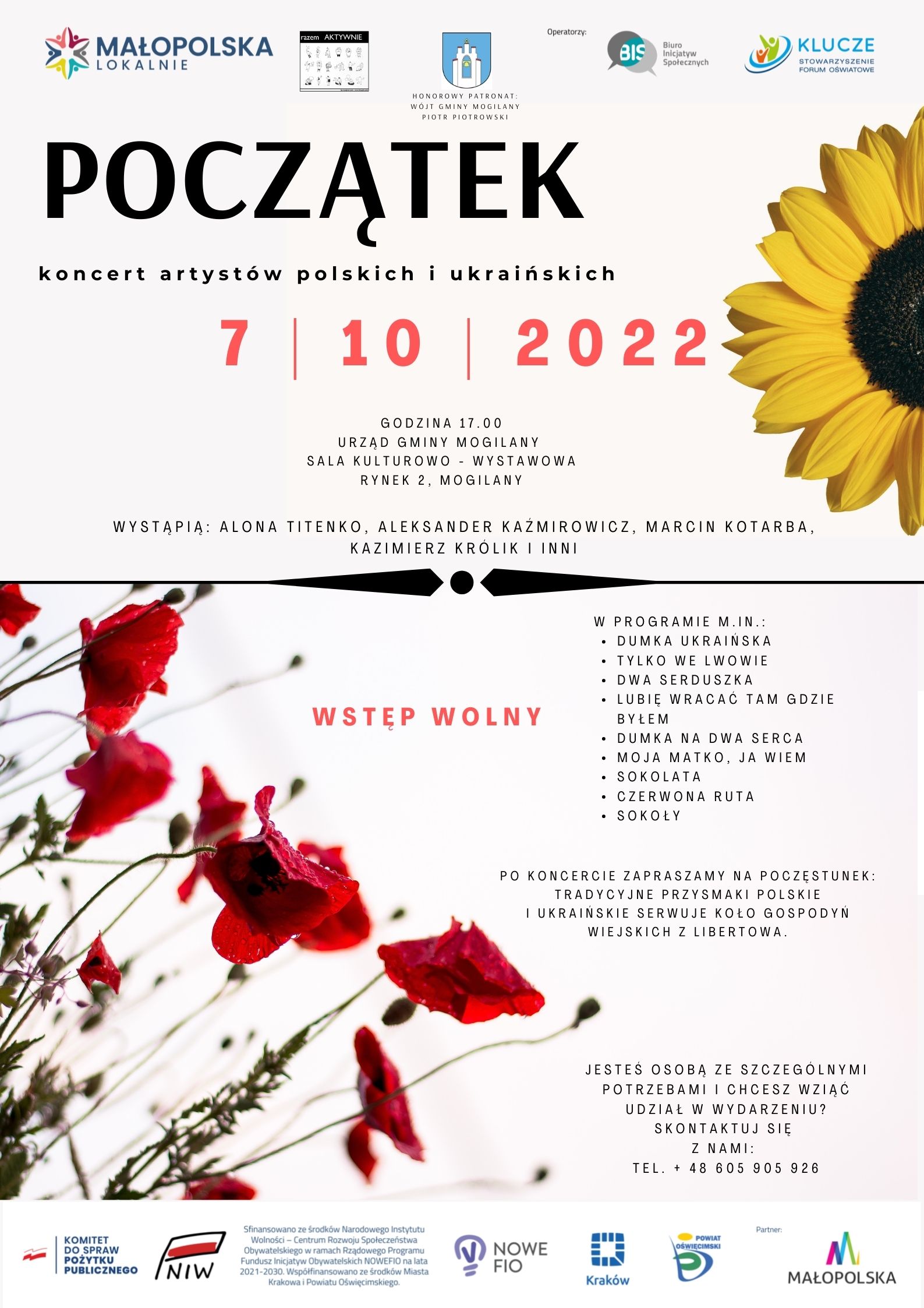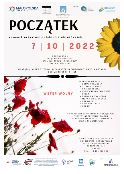Już 7 października piątkowe popołudnie możemy spędzić w Mogilanach podczas organizowanego przez Grupę Razem Aktywnie wieczoru kultury polskiej i ukraińskiej. Podczas wydarzenia będziemy mogli wysłuchać koncertu artystów z Gminy Mogilany. Wśród występujących znajdą się m.in. Alona Titenko i Aleksander Kaźmirowicz - wykonawcy muzyki ukraińskiej, Marcin Kotarba – śpiewak operowy i Kazimierz Królik – mogilański muzyk i wokalista ludowy. Czeka na Państwa mnóstwo muzycznych niespodzianek, m. in. ukraińska wersja „Dumki na dwa serca”, ciekawe aranżacje i wykonania muzyki ludowej, estradowej i popularnej. Po koncercie tradycyjne potrawy, ukraińską szubę i polskie przekąski, serwuje Koło Gospodyń Wiejskich z Libertowa.