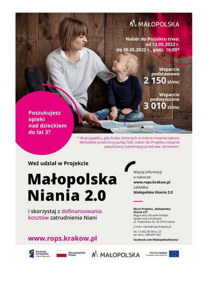 W ramach Projektu przyznawane są granty na dofinansowanie kosztów wynagrodzenia niani zatrudnionej przez zamieszkałych w woj. małopolskim rodziców, którzy w związku z koniecznością sprawowania opieki nad dzieckiem w wieku do lat 3 mają problem z funkcjonowaniem na rynku racy.