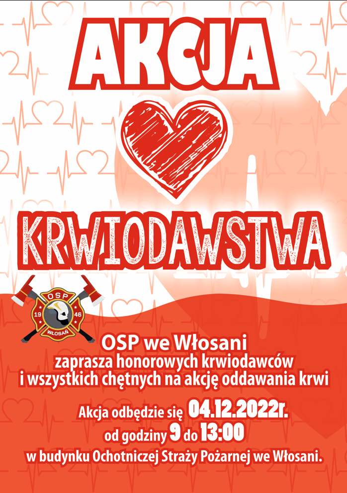 W załączniku plakat o akcji krwiodawstwa organizowaną przez Ochotnicza Straż Pożarna we Włosani