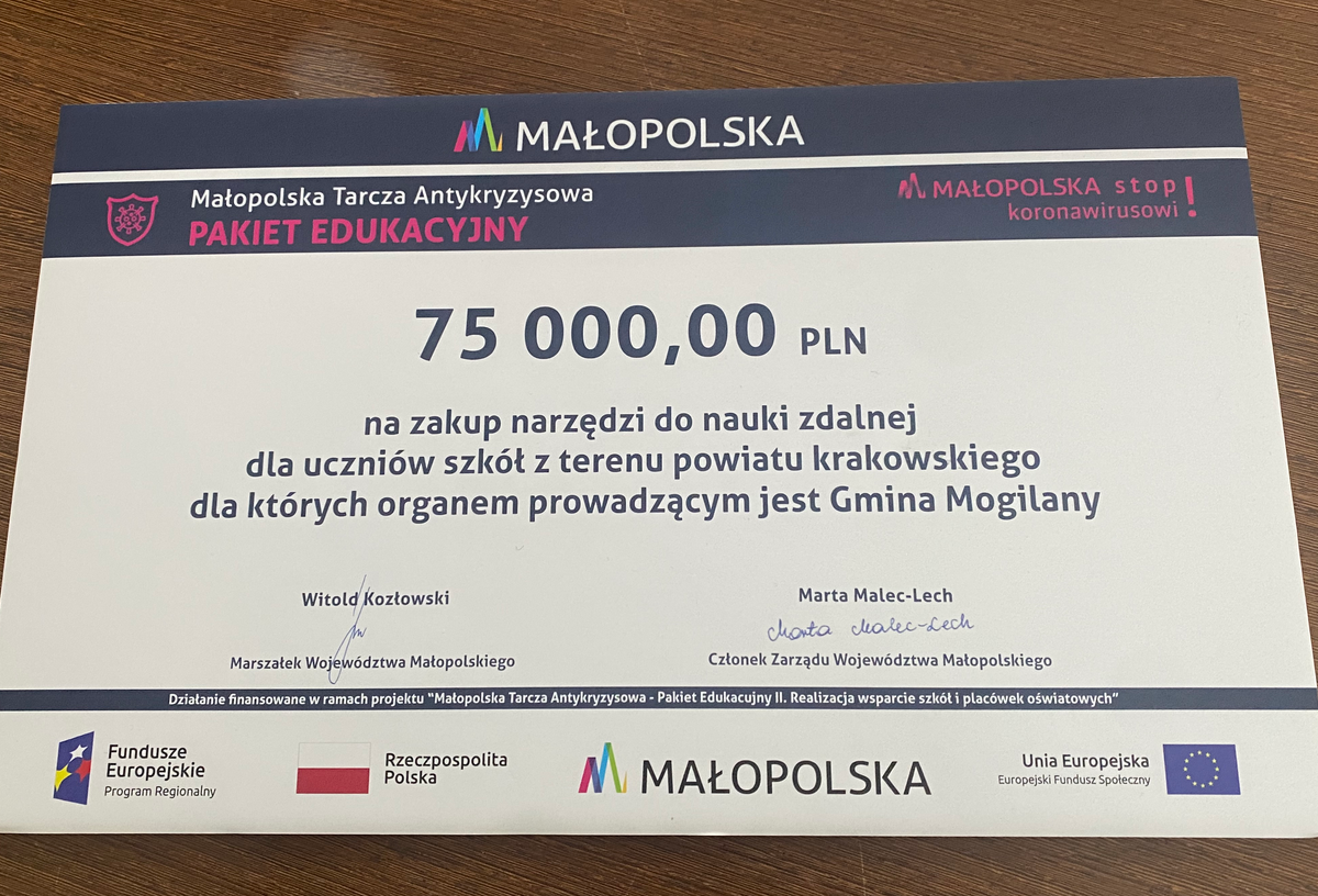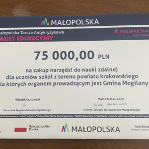 Promesę dla Gminy Mogilany odebrała Zastępca Wójta p. Edyta Misztal. Na zakup sprzętu dla wszystkich szkół prowadzonych przez Gminę pozyskaliśmy 75 000 zł. Kupione zostaną laptopy i monitory interaktywne.