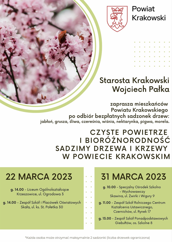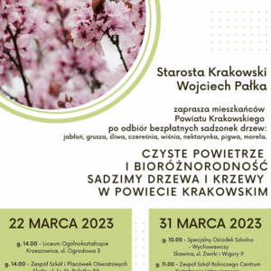 Starosta Krakowski, w ramach realizacji zadania pn.: „Czyste powietrze i bioróżnorodność – sadzimy drzewa i krzewy w powiecie krakowskim” zaprasza mieszkańców po odbiór bezpłatnych sadzonek drzew: jabłoni, gruszy, śliwy, czereśni, wiśni, moreli, nektarynki i pigwy. Sadzonki będą rozdawane na terenie 5 gmin powiatu krakowskiego (Czernichów, Krzeszowice, Skała, Skawina, Wielka Wieś) w dniach 22.03.2023 r. i 31.03.2023 r.