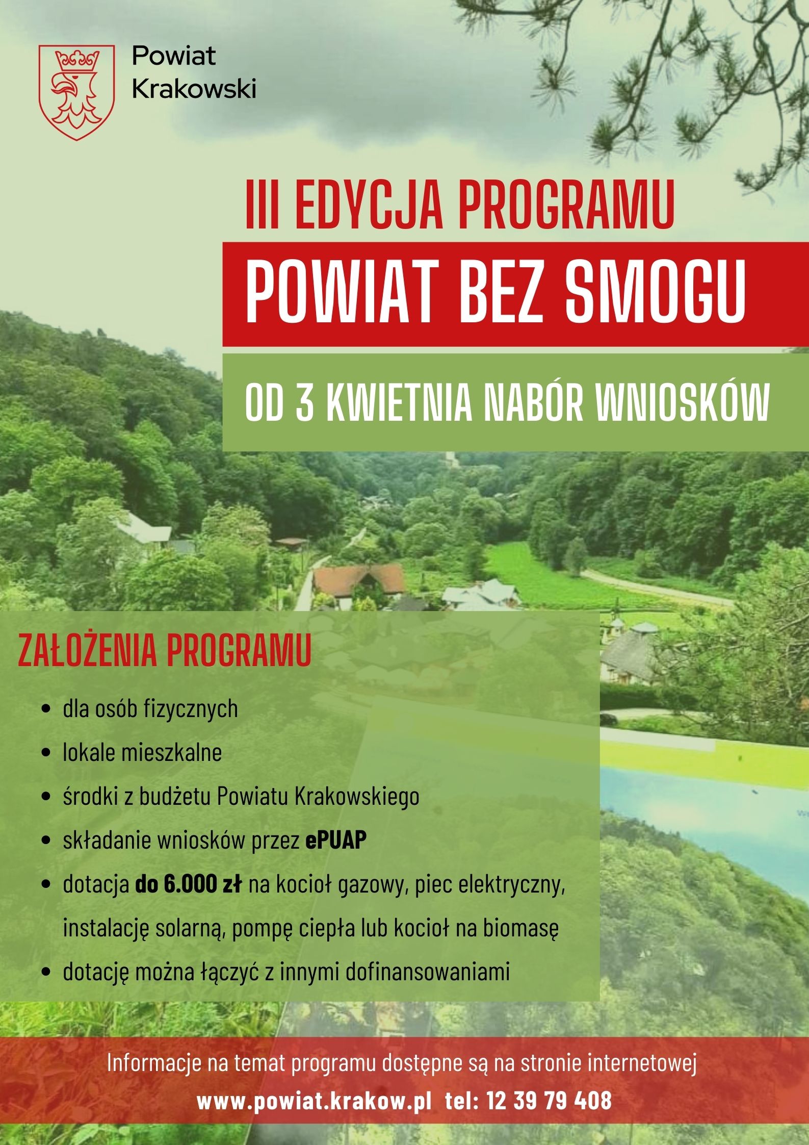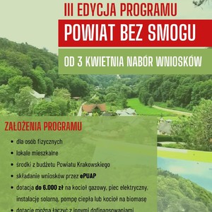 Zarząd Powiatu w Krakowie uprzejmie informuje, że rozpoczęcie procedury naboru wniosków w ramach programu „Powiat bez smogu” nastąpi 3 kwietnia 2023 r.
