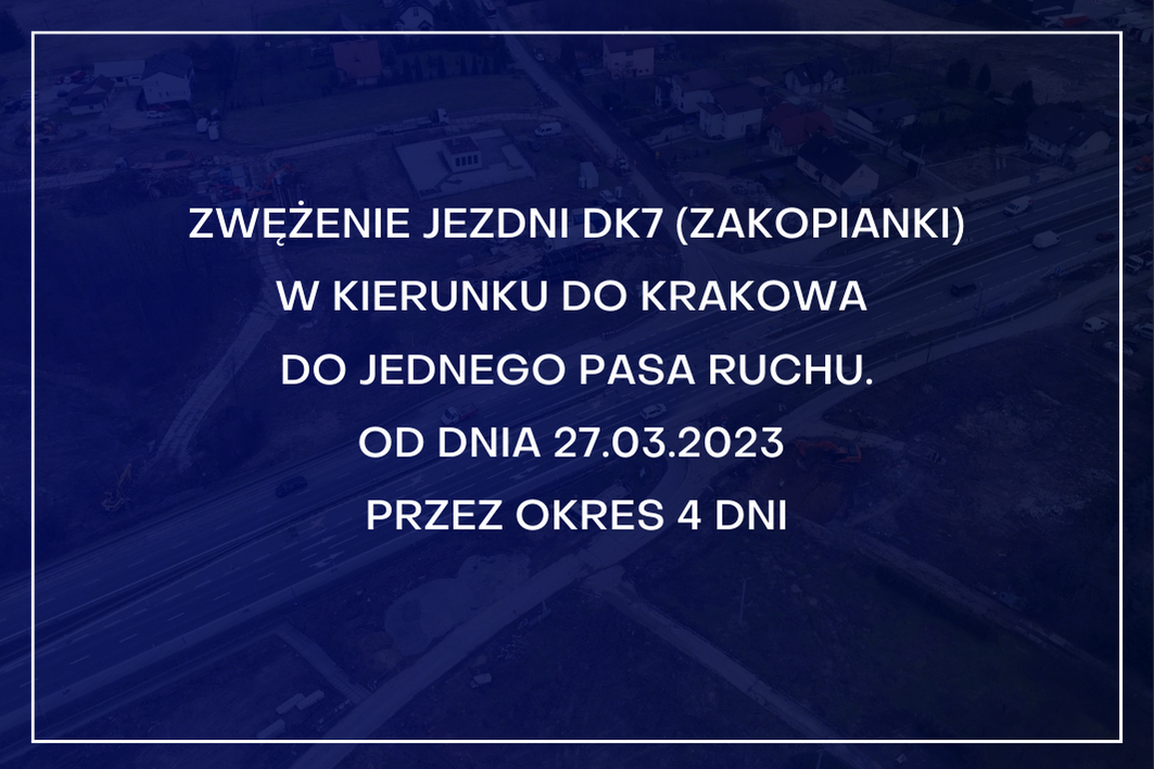 W związku z budową węzła na skrzyżowaniu ul. Widokowej - Zadziele z Zakopianką, wykonawca robót planuje zwężenie jezdni DK7 (Zakopianki) w kierunku do Krakowa do jednego pasa ruchu od dnia 27.03.2023.