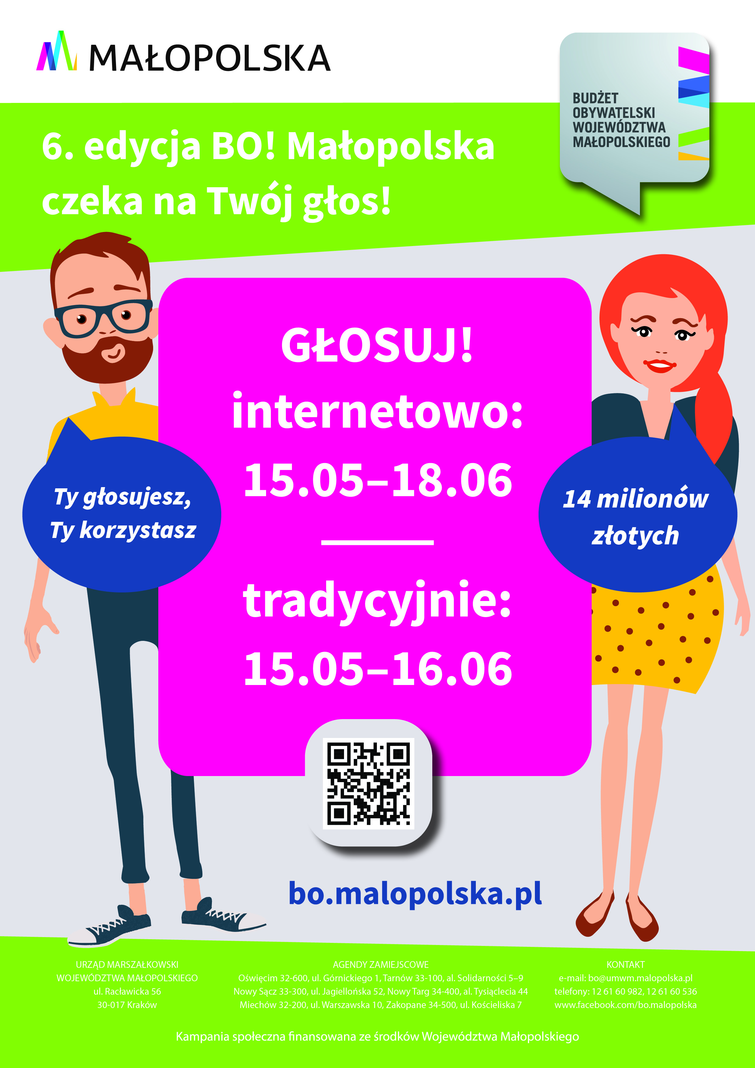 Rusza głosowanie w 6. edycji Budżetu Obywatelskiego Województwa Małopolskiego. Od połowy maja do połowy czerwca każdy mieszkaniec Małopolski może zdecydować, które zadania będą realizowane w kolejnych latach. Do wyboru jest blisko 200 propozycji! Na wcielenie w życie najlepszych Zarząd Województwa Małopolskiego przeznaczy 14 mln zł.