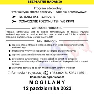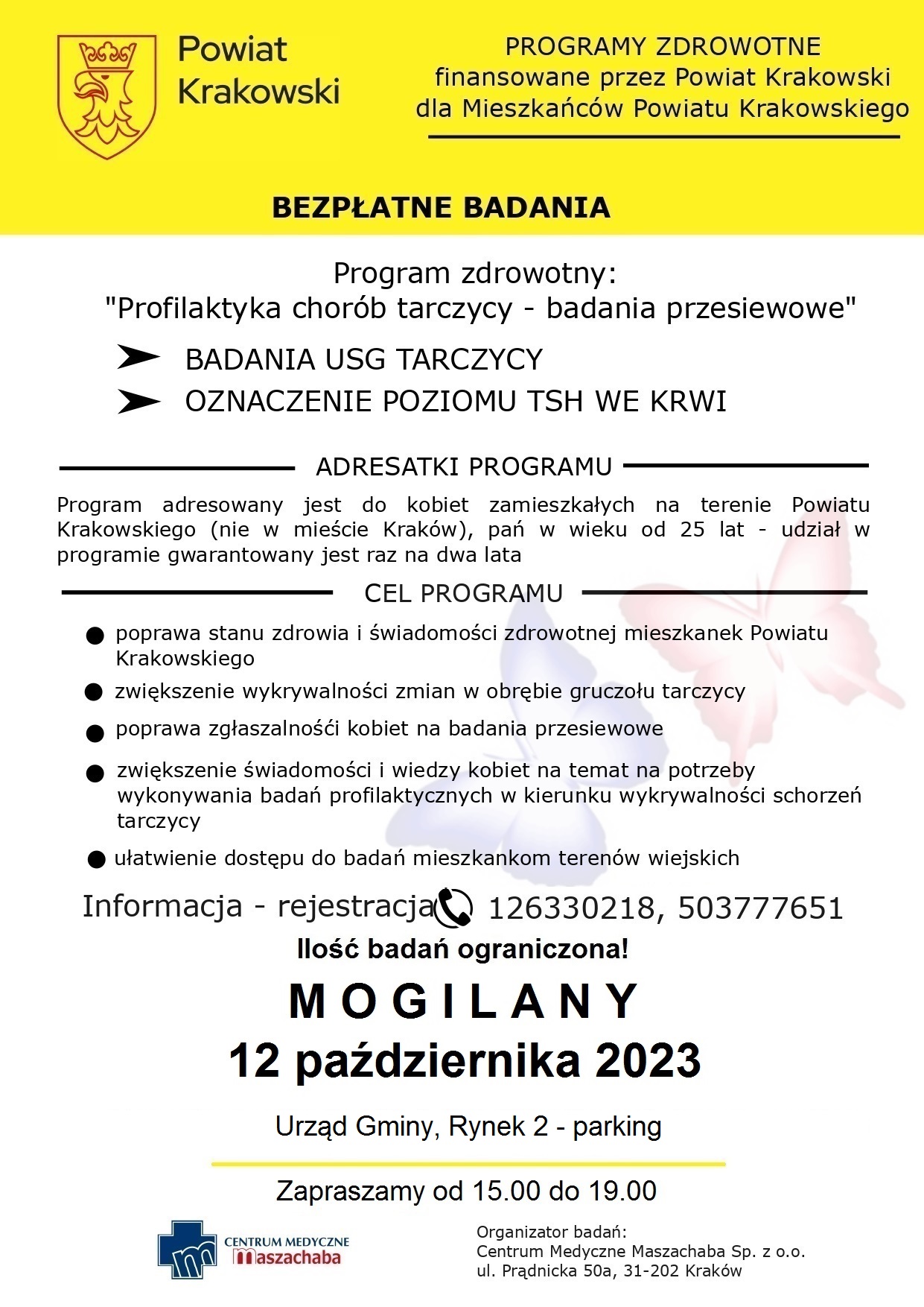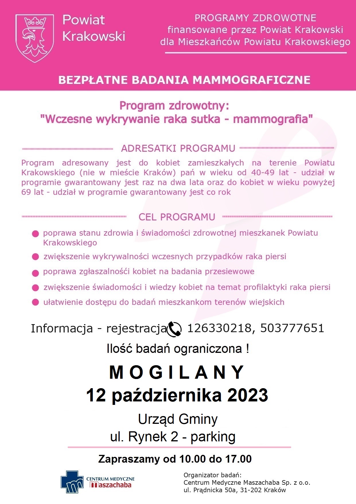 Centrum Medyczne MASZACHABA w Krakowie zaprasza Mieszkanki Powiatu Krakowskiego do wykonania bezpłatnych badań profilaktycznych - mammografii i badań tarczycy finansowanych ze środków Powiatu Krakowskiego.