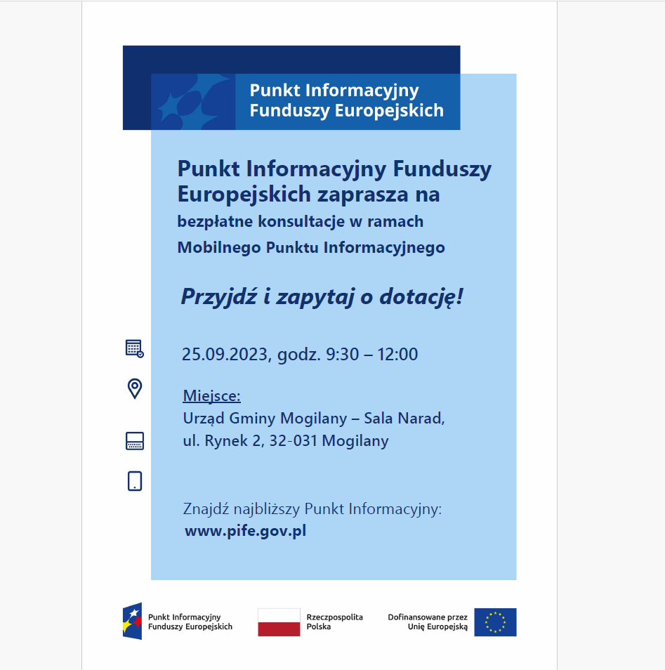 Zapraszamy Państwa na bezpłatne konsultacje w ramach Mobilnego Punktu Informacyjnego Funduszy Europejskich. Podczas konsultacji specjalista przedstawi informacje na temat bieżących możliwości wsparcia ze środków UE, w tym środków na: