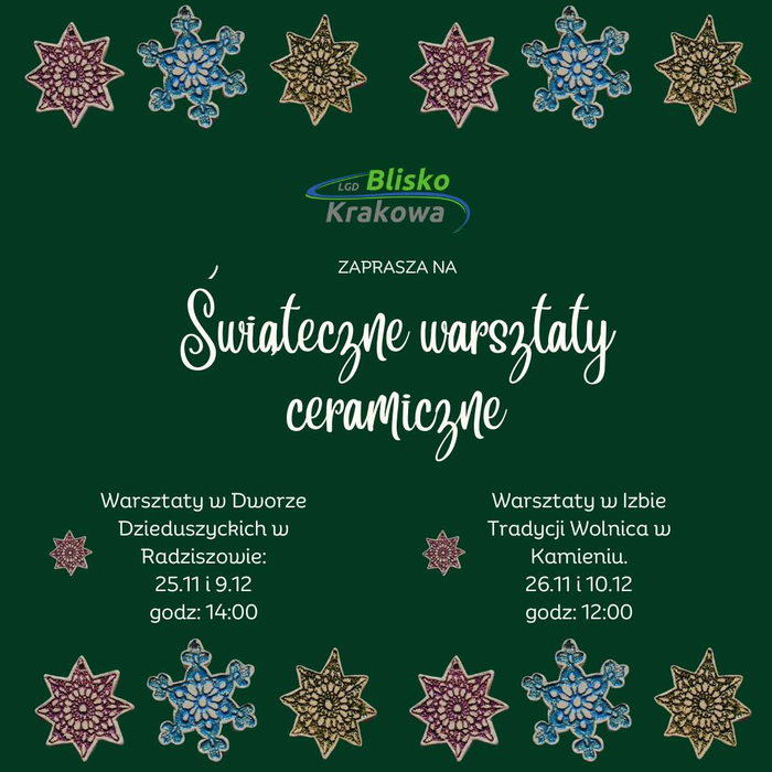 Warsztaty będą składać się z dwóch spotkań, na pierwszym będziemy wykrawać swoje ozdoby ze specjalnej masy ceramicznej oraz poznamy metody ozdabiania. Po tych zajęciach prace zostaną wypalone na tzw. biskwit (850 stopni) w piecu ceramicznym.