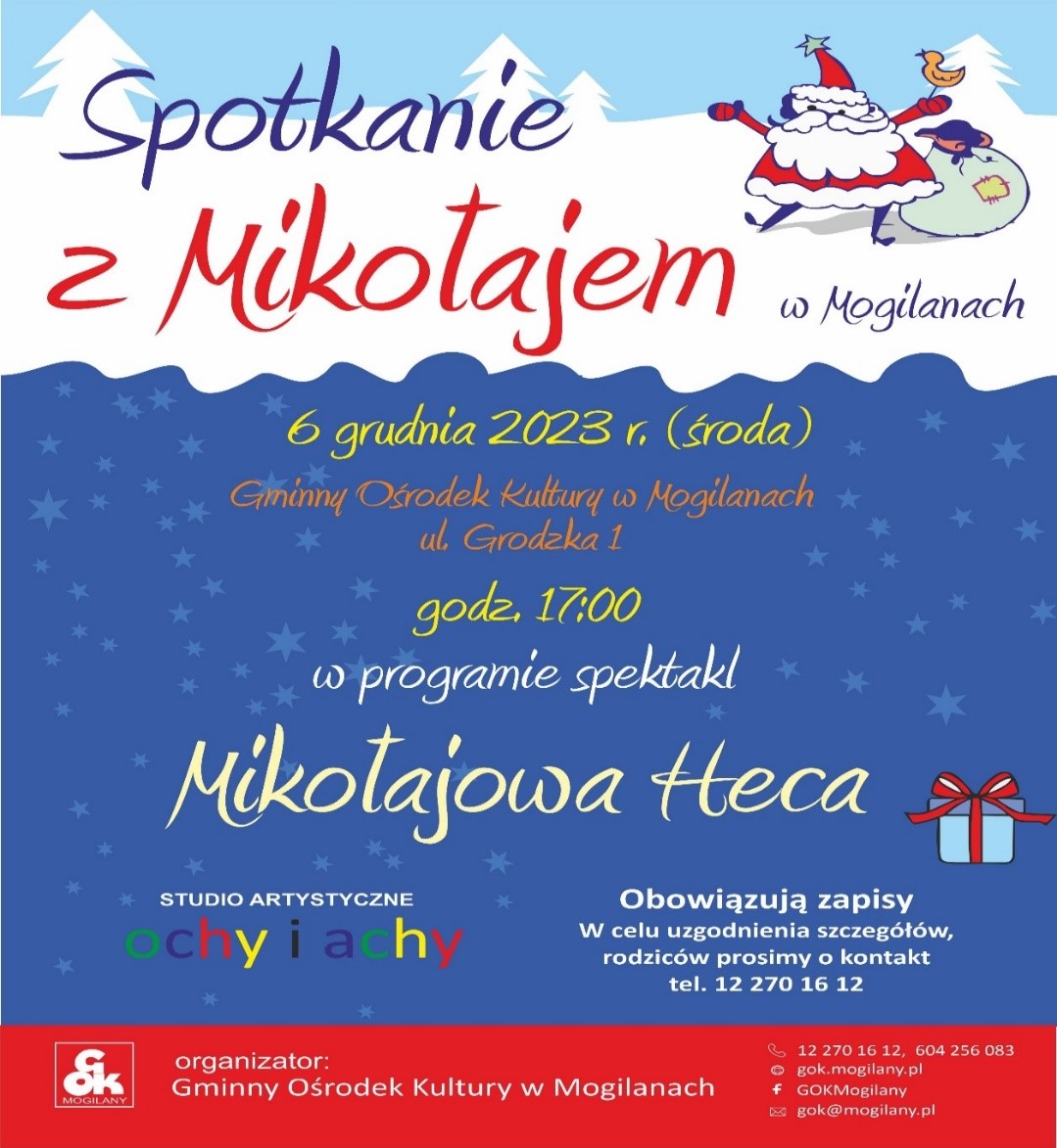 Gminny Ośrodek Kultury w Mogilanach serdecznie zaprasza na spotkanie z Mikołajem, które odbędzie się 6 grudnia 2023 r. w Gminnym Ośrodku Kultury w Mogilanach o godzinie 17.00.