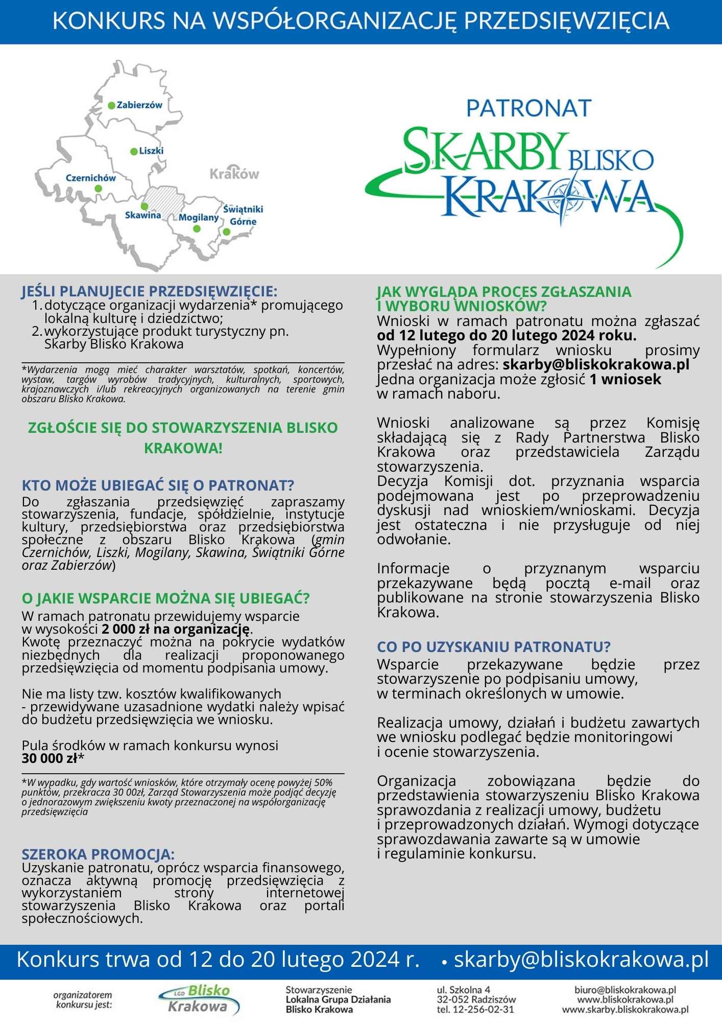 LGD Blisko Krakowa działająca na terenie gmin: Czernichów, Liszki, Mogilany, Skawina, Zabierzów zaprasza do wzięcia udziału w kolejnej edycji konkursu na współorganizację przedsięwzięcia! W ramach konkursu można uzyskać dofinansowanie na organizację wydarzeń promujących lokalną kulturę i dziedzictwo przyrodnicze. Wnioski należy zgłaszać w terminie od 12 lutego 2024 r. do 20 lutego 2024 r.
