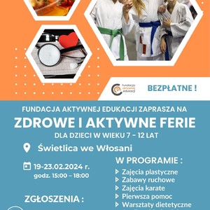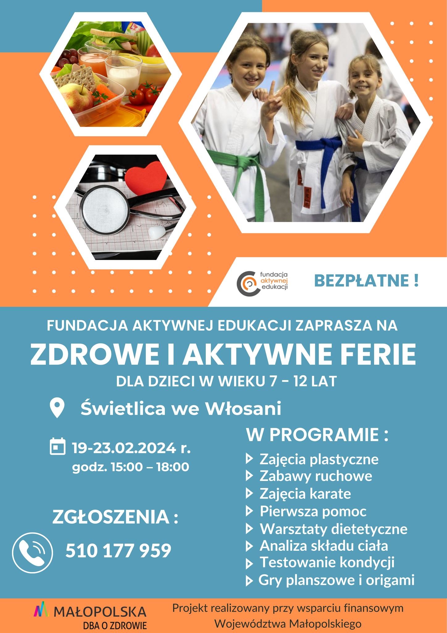 Zapraszamy do udziału w bezpłatnych zajęciach prozdrowotnych i ruchowych pt. „Zdrowe i aktywne ferie”, które odbędą się w przerwie zimowej od 19 – 23.02.2024, w godzinach od 15-18, na Świetlicy we Włosani. W programie zajęcia plastyczne, ruchowe i wiele innych.