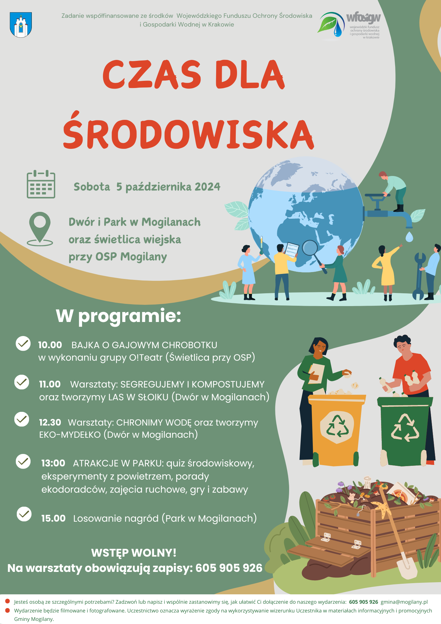 W sobotę, 5 października zapraszamy do centrum Mogilan na CZAS DLA ŚRODOWISKA. Po części warsztatowej dla dzieci i młodzieży z wybranych szkół nadszedł czas na wydarzenie otwarte dla wszystkich chętnych: spektakl dla najmłodszych, warsztaty dla dużych i mniejszych, atrakcje w mogilańskim parku i super nagrody.