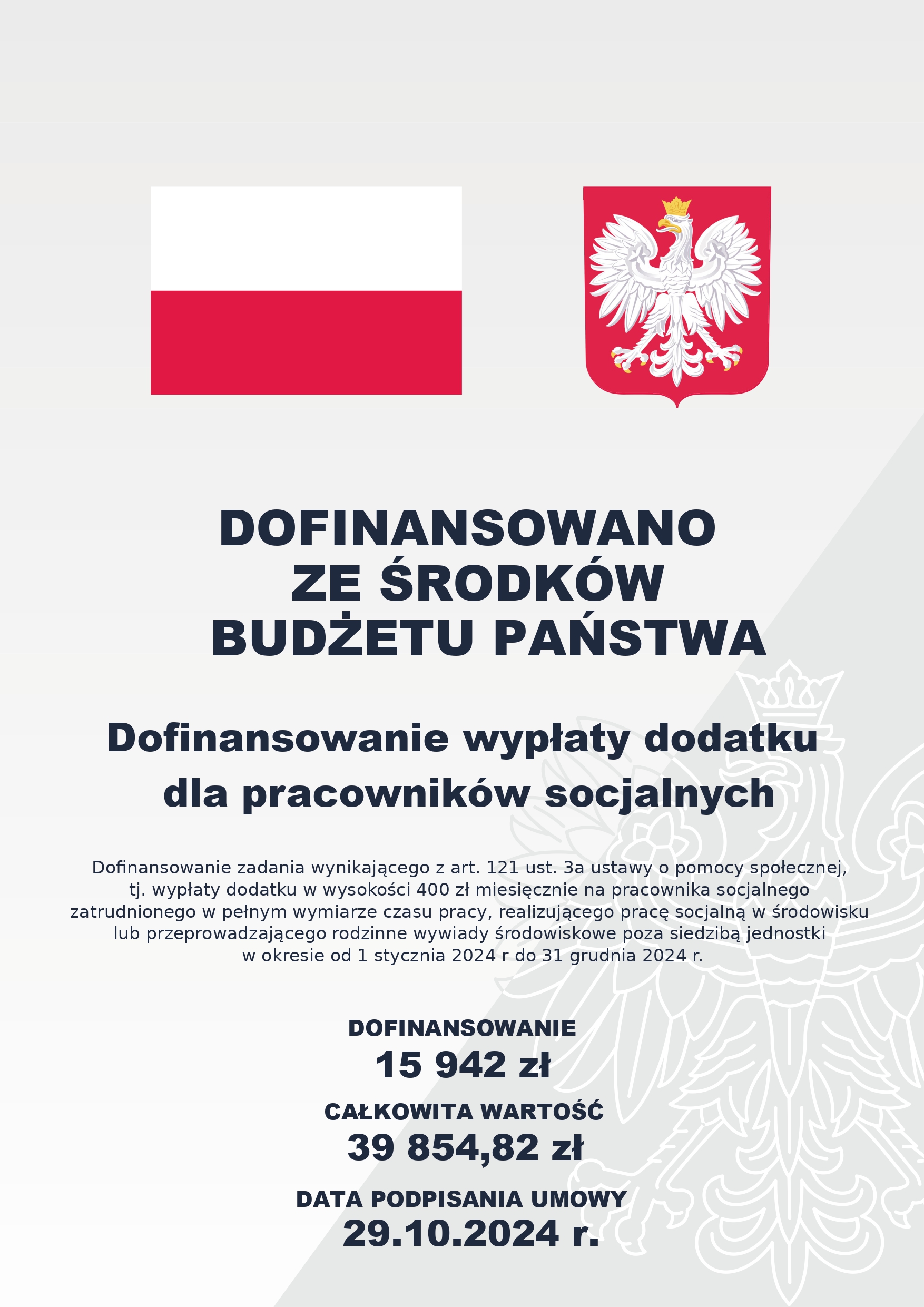 Środki przeznacza się dofinansowanie zadania własnego beneficjenta wynikającego z art. 121 ust. 3a ustawy o pomocy społecznej, tj. na wypłatę dodatku w wysokości 400 zł miesięcznie na pracownika socjalnego zatrudnionego w pełnym wymiarze czasu pracy, realizującego pracę socjalną w środowisku lub przeprowadzającego rodzinne wywiady środowiskowe poza siedzibą jednostki w okresie od 1 stycznia 2024 r do 31 grudnia 2024 r. W przypadku zatrudnienia pracownika w mniejszym wymiarze czasu pracy, dodatek przysługuje w wysokości proporcjonalnej do czasu pracy.