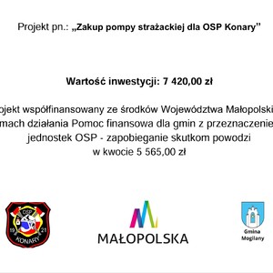 Projekt "Zakup pompy strażackiej dla jednostki OSP Konary" współfinansowany został ze środków Województwa Małopolskiego.