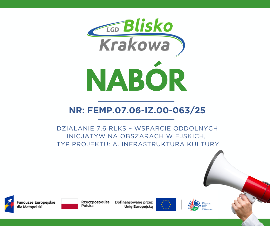 Lokalna Grupa Działania Blisko Krakowa ogłasza nabór wniosków o dofinansowanie projektów w ramach Priorytetu 7. Fundusze europejskie dla wspólnot lokalnych, Działanie 7.6 RLKS – Wsparcie oddolnych inicjatyw na obszarach wiejskich, typ projektu: A. Infrastruktura kultury.