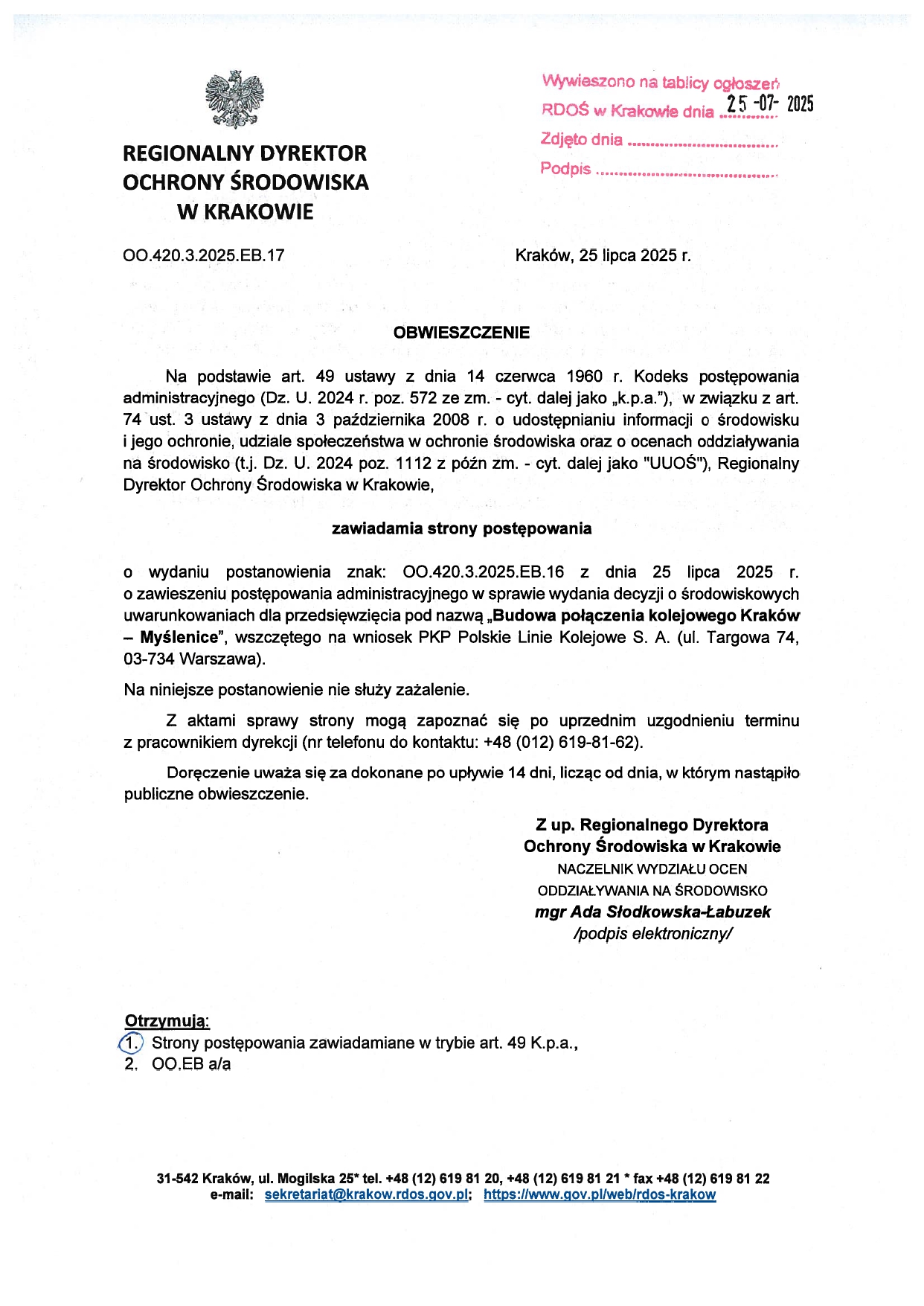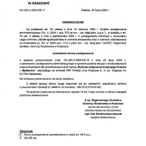 Regionalny Dyrektor Ochrony Środowiska w Krakowie na stronie gov.pl/web/rdos-krakow/rok-20210 udostępnił obwieszczenie z dnia 25 lipca 2025 r. o zawieszeniu postępowania administracyjnego w sprawie wydania decyzji o środowiskowych uwarunkowaniach dla przedsięwzięcia pod nazwą ,,Budowa połączenia kolejowego Kraków - Myślenice’’ wszczętego na wniosek PKP Polskie Linie Kolejowe S.A.