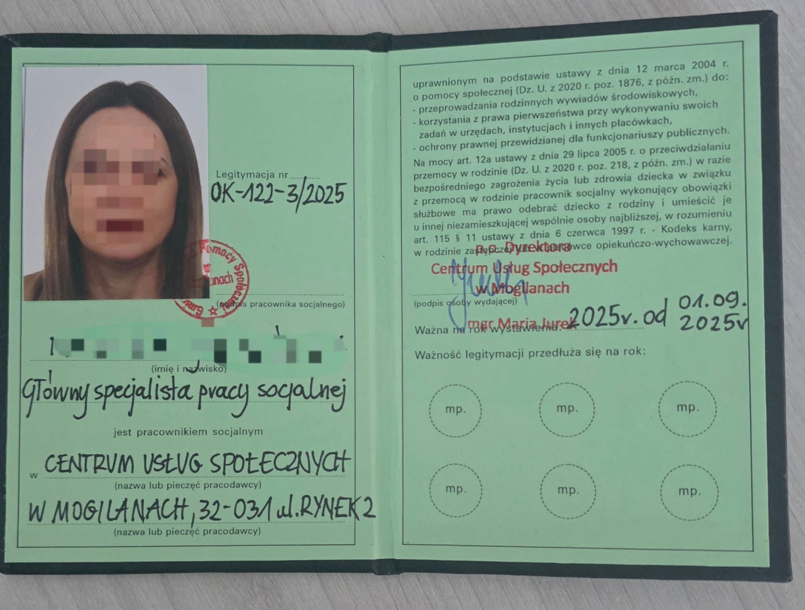 Co ważne - pracownicy socjalni posiadają legitymację służbową, którą okazują, by potwierdzić wiarygodność i zazwyczaj wcześniej zapowiadają swoją wizytę. Legitymacja zawiera numer, imię i nazwisko, nazwę instytucji, którą reprezentują, zdjęcie pracownika, pieczątkę z datą ważności (tak jak na zdjęciach poniżej).